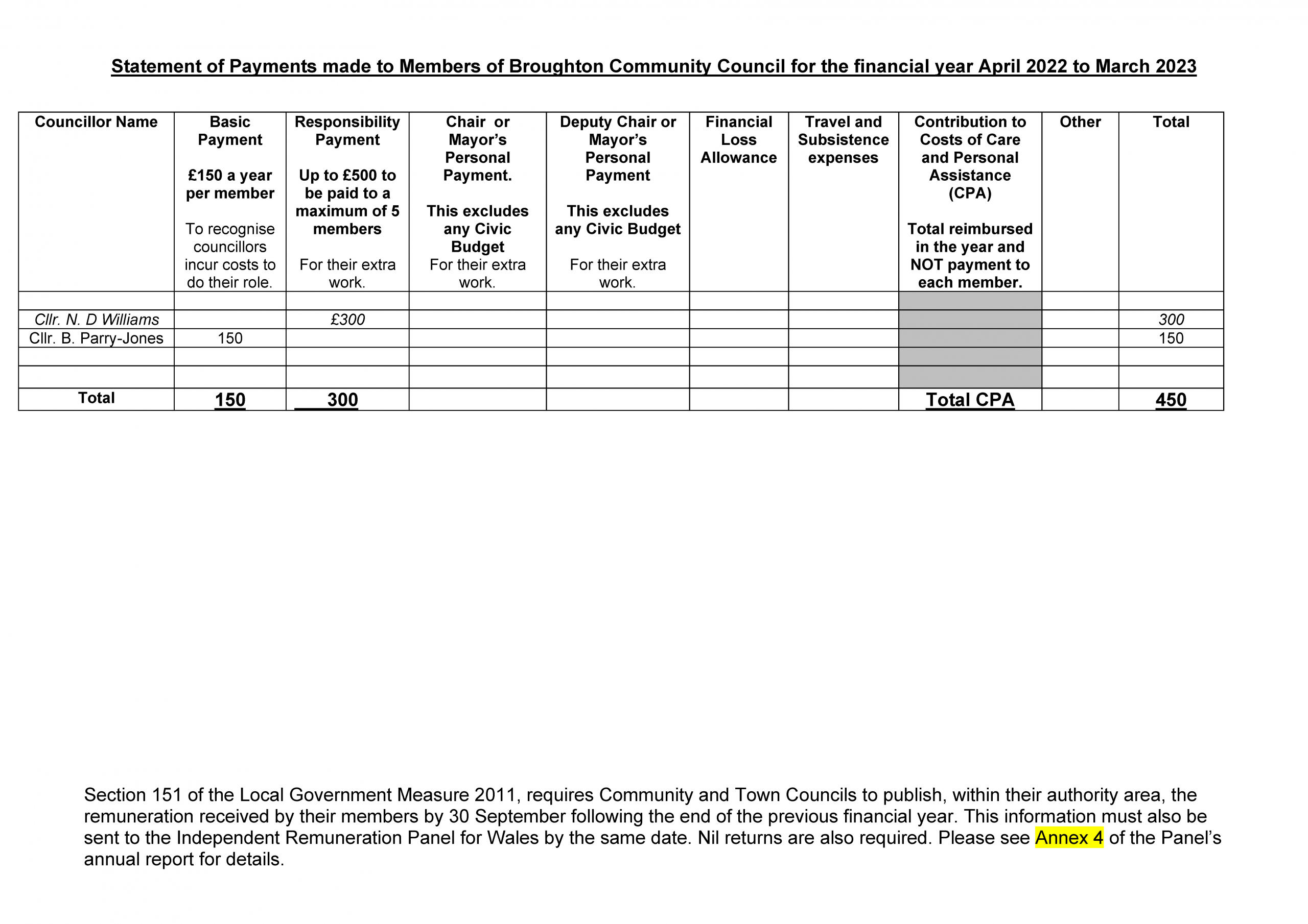 Statement of Payments made to Members of Broughton Community Council for the financial year April 2022 to March 2023